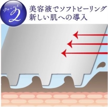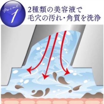 肌に有効な栄養成分を豊富に含んだ2種類の美容液による水流で、毛穴の汚れと、古くなった角質を洗浄します。