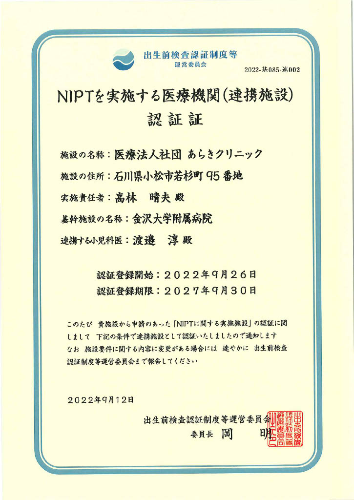 あらきクリニックは、日本医学会 出生前検査認証制度等運営委員会によって2022年9月に認証された「NIPTを実施する医療機関(連携施設)です。