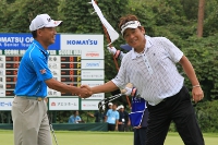 ![]() 健闘をたたえあう尾崎プロと植田プロ |