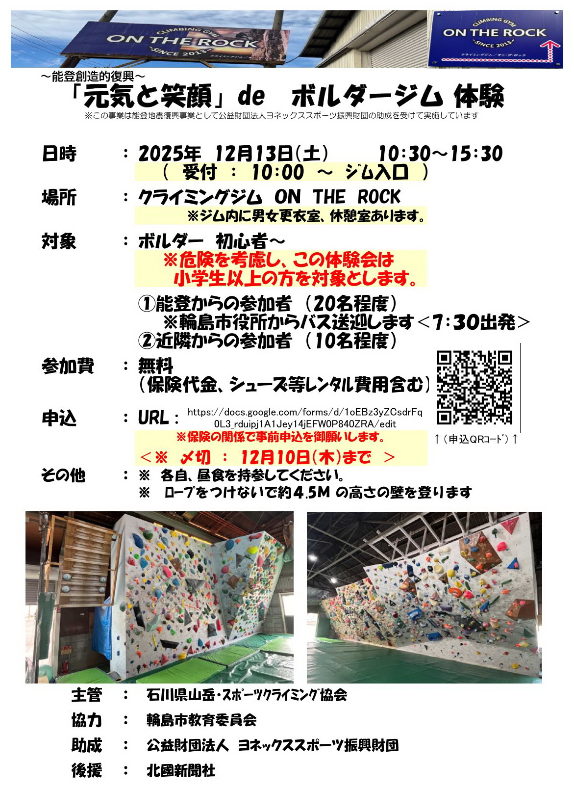 以下の通りクライミング体験会を開催しますので多数のご参加をお待ちしています。