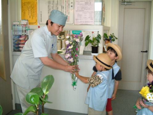 次の日ばら組さんは羽咋の老人ホーム眉丈園にお花を持って訪問しました。