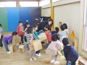 たんぽぽぐみさんはすみれぐみさんのお部屋で久保先生と過ごしました。