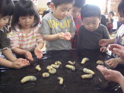 幼虫は体をくねくねさせながら、土の中に入っていきました。