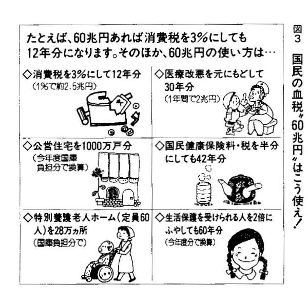 軍事贅や必要のない公共事業責などのむだをけずり、減税や国民生活に必要な制度を改善したり、新設したりする財源にする。