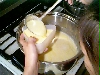 4. オレンジゼリーのなべに、3で作った生クリームのボールをまぜる。(火にはかけない)