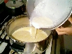 3. ババロアはゼリーを火にかけている時に作る。まず、生クリームとたまごをボールに入れてかきまぜる。まぜたらさらに牛乳を入れてかきまぜる。